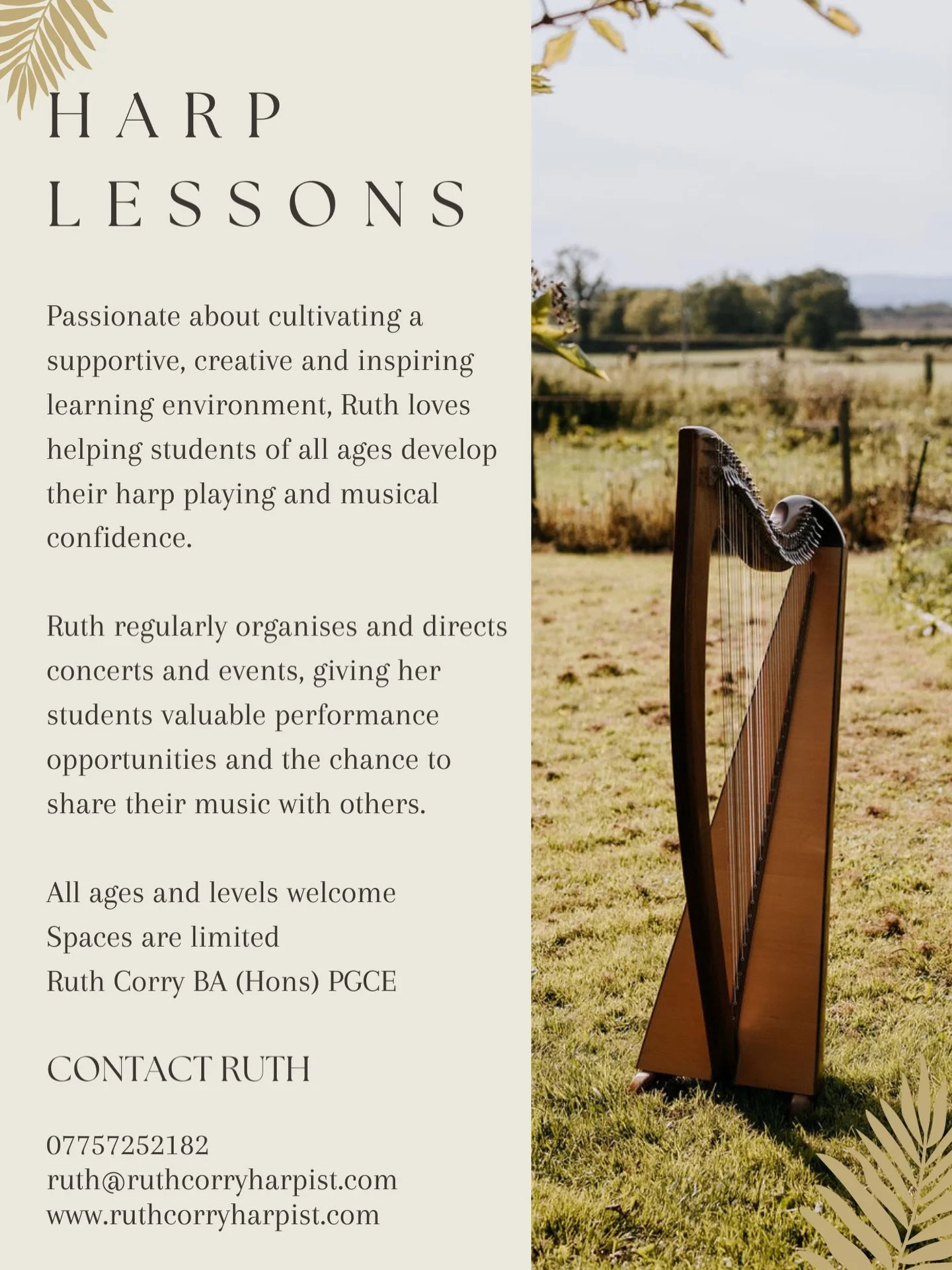 Ruth Corry is an Irish harpist from Belfast and has been playing the harp for over 20 years. She graduated from Durham University with a BA (Hons) in Music where she was awarded a first class for her final recital, and where she also completed a PGCE in Primary Teaching.